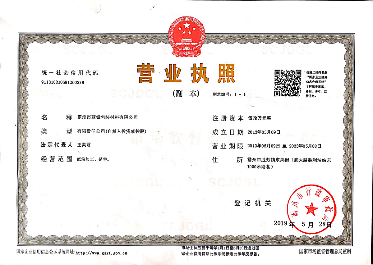 霸州市藍鋒包裝材料有限公司,前身為成立于1988年的勝芳鎮藍劍紙箱廠。是河北省較早涉足紙包裝制品的民營企業。經過近三十年的發展,公司已經由起初的家庭作坊發展為現有標準化廠房8000平米,員工50人,其中管理人員7名;年產紙箱上億平米的現代化企業。